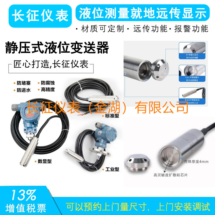 靜壓式水位計 根據壓力與水深成正比關系的靜水壓力原理,運用壓敏元件作傳感器的水位計。采用隔離型擴散硅敏感元件制作而成,直接投入容器或水體中即可精確測量出水位計末端到水面的高度,并將水位值通過4-20mA電流或RS485信號對外輸出。